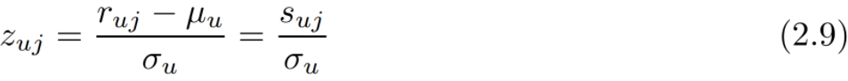 - 평균 중심 등급 대신 평균 중심 등급에 사용자 u가 매긴 등급들의 표준편차로 평균 중심 등급을 나눕니다.