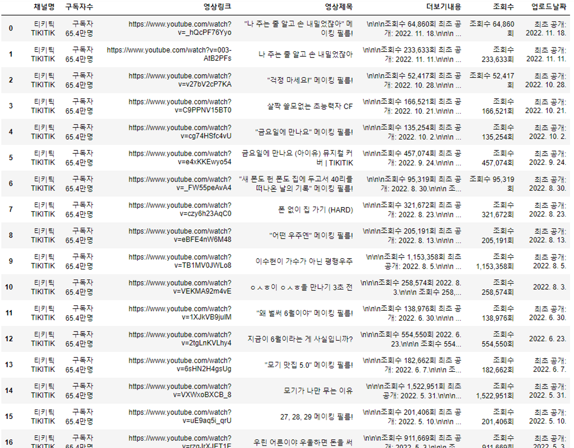 creator_data.append([channel_name, follower, vod_link[i], vod_title, more_text, view_cnt, pub_dt])