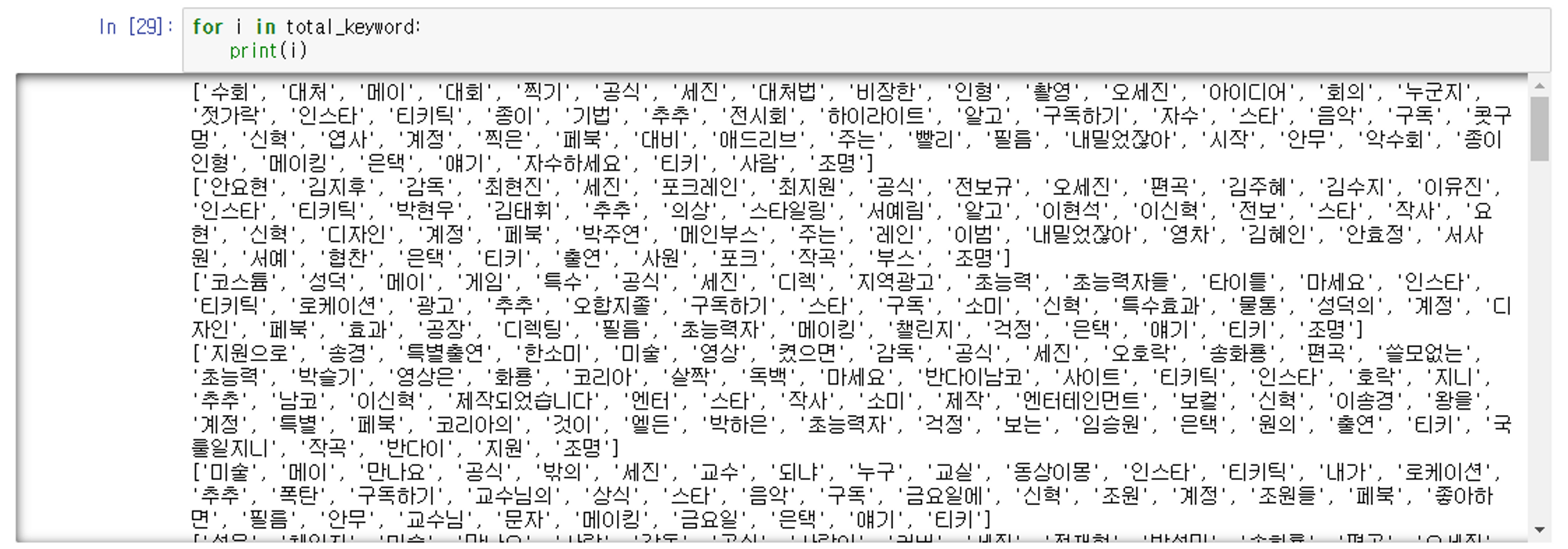 temp = ''.join(str(result_df.loc[i]['영상제목'])+' '+str(result_df.loc[i]['더보기내용']))