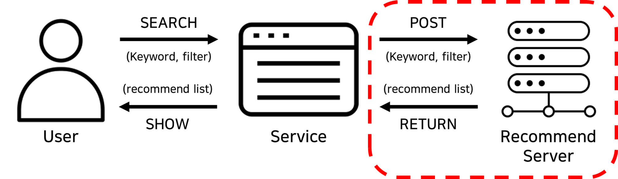 서비스 운영서버 → (데이터 요청-검색 키워드, 필터 포함) → 추천 시스템 서버 → 키워드 및 필터에 맞는 크리에이터 리스트 리턴 → 서비스 운영서버에서 해당 리스트 처리 → 노출