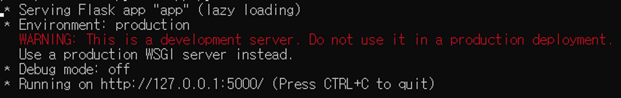 위의 코드대로 app.py를 만들어 터미널에서 app.py가 위치한 곳으로 이동하여 python app.py를 실행시키면 아래와 같은 문구가 출력된다.