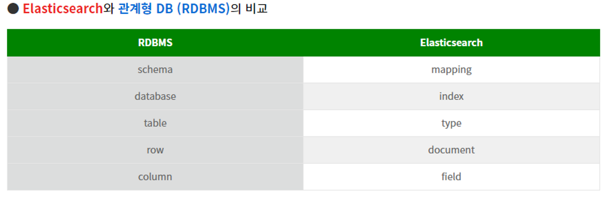 RDBMS와 엘라스틱서치와의 특징은 아래와 같다.